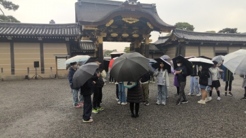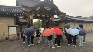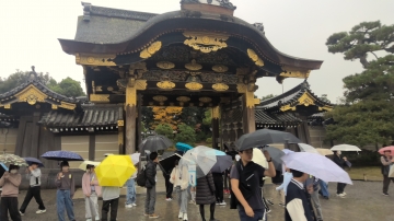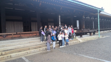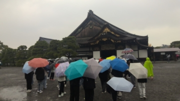 二条城の見学です。唐門の前で説明を聞いた後、二条城の中を見学しました。とても空いていてゆっくりと見学することができました。襖絵の力強さ豪華さやウグイス張りの廊下にも感動していました。