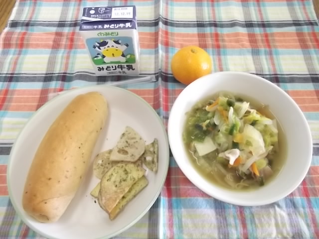 【メニュー】小型バターロール 牛乳 ポテトのミートグラタン 白菜スープ りんご 今(きょ)日(う)の給(きゅう)食(しょく)には、冬(ふゆ)が旬(しゅん)の「りんご」がついています。「りんご」は秋(あき)から冬(ふゆ)にかけておいしくなるくだものです。「りんご」は日(に)本(ほん)だけでなく、世(せ)界(かい)中(じゅう)のいろいろな国(くに)で食(た)べられているくだものです。今(きょ)日(う)は、日(に)本(ほん)で一番(いちばん)「りんご」の生(せい)産(さん)量(りょう)が多(おお)い、青(あお)森(もり)県(けん)でとれた「サンふじ」という品(ひん)種(しゅ)のりんごです。 「りんご」には、おなかの調(ちょう)子(し)を整(ととの)えてくれる働(はたら)きがあります。よくかんで食(た)べましょう。 | |