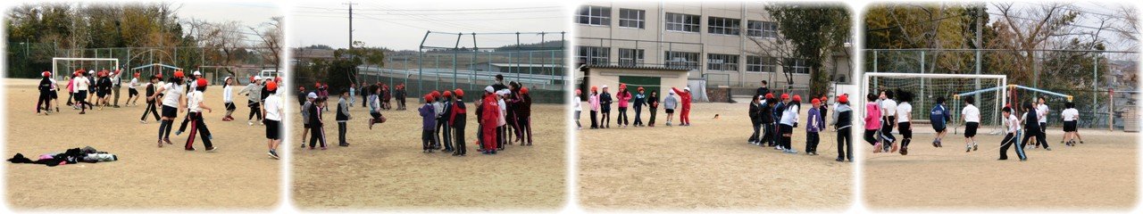 2月になりましたが,4年生は元気いっぱいです。 この日はなわとび集会。学年で8の字とび(スピードロープ)とグループとび(スクラムロープ)に挑戦しました。 この日のために子ども達はクラスで教えあったり協力したりしながら練習してきました。 どのクラスも目標目指して精一杯がんばる姿が見られました。 | |