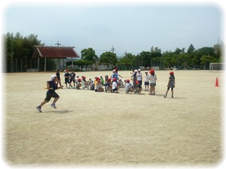 運動場でエンドレスリレー(どちらかが追いつくまでずっと続くリレー)をしているクラスがありました。学級会で自分達で企画した遊びをしているようです。 夢中になって走る子どもや,運動会で学んだ応援をする子どもの姿が見られました。 | |