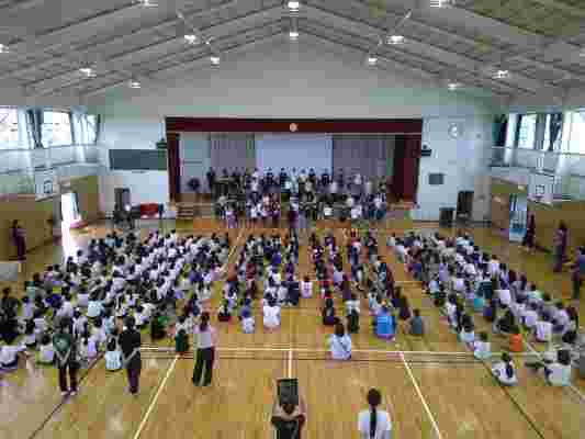 本日5限目全校集会を行いました。内容は、明日三泗音楽会に参加する6年生の合唱披露と三泗小中科学展・社会科展・美術展の入賞者への表彰式を行いました。