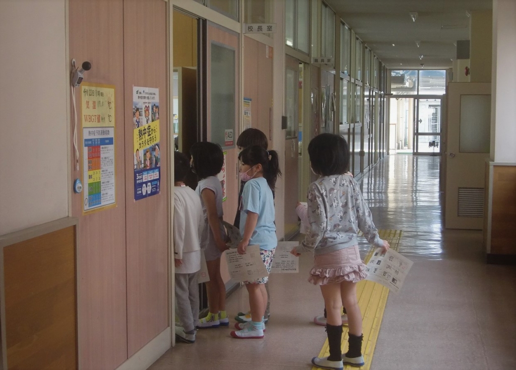 4月23日に、二人ずつペアを組んで、学校たんけんをしました。自分たちだけで、いろいろな部屋をさがして、スタンプを押していきます。どこにあるのかわからず、悪戦苦闘していましたが、なんとか全員3・4限目で12の部屋を探して、スタンプを押すことができました。