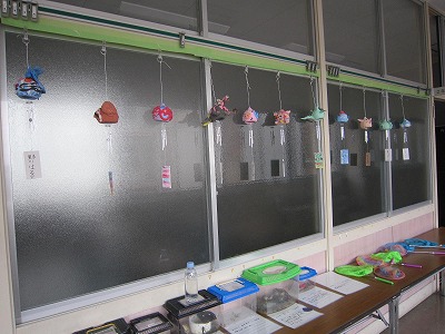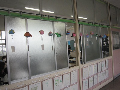 2年生の教室の前に、涼しく感じさせてくれる風鈴が飾られています。