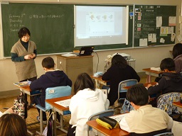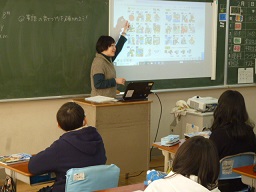 楠小学校では、中学校の先生が小学校に来て、小学校の先生とともに外国語の授業を行っています。