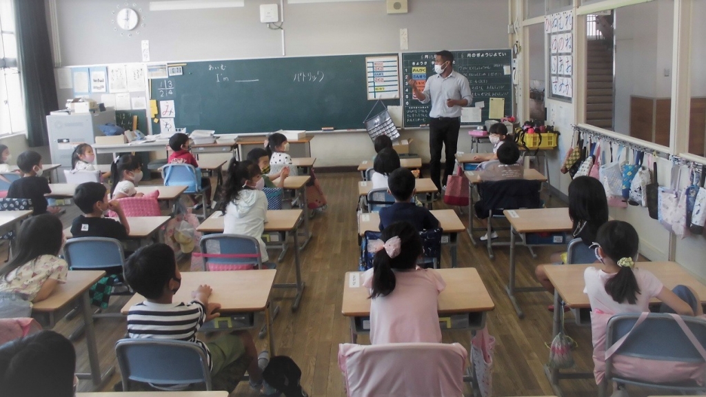 14日に初めての外国語活動がありました。外国語指導のパトリック先生に「I 'm 〇〇」という名前の言い方や英語のじゃんけんのやり方を教えてもらい、その後、みんなでゲームを楽しみました。大盛り上がりで、その日の帰りの会では、「外国語の時間が楽しかったです。」という意見がたくさん聞かれました。