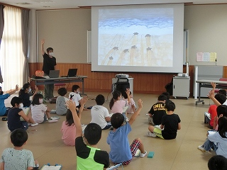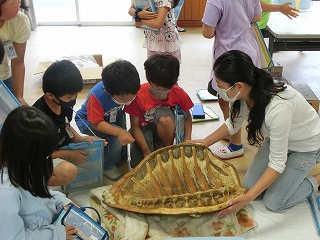 7月6日(火)ウミガメの保護活動を行っているウミガメネットワークの方に来ていただき、ウミガメの学習を行いました。産卵の様子を映像で見せていただいたり、標本を使って説明を聞かせてもらったりしました。地域にある吉崎海岸には、アカウミガメが産卵に来るのですが、最近は見られていません。お話を聞いて、子どもたちは、きれいな海岸を残すために自分たちにできることを考えていました。