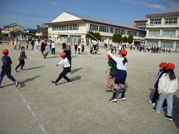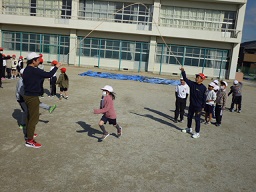 短縄跳びでは、ペア学年でグループを作り、いろいろな跳び方を教え合いながら練習していました。「もうちょっと」「すごいね」「やったね」と声を掛け合っているところが素敵です。