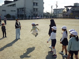 ペア学年(1・6年、2・4年、3・5年)で短縄跳びや大縄跳び(八の字跳び)に挑戦します。
