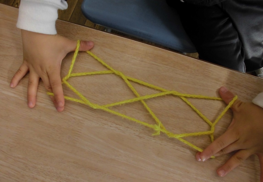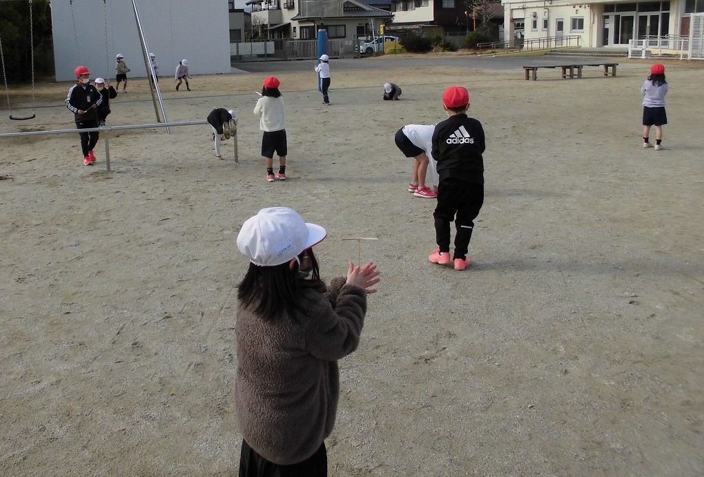 今、生活科の学習で、昔のあそびについて学習しています。「◯◯名人になろう」というめあてで、竹とんぼ、けん玉、コマ、あやとり、だるま落とし、お手玉などのあそびにチャレンジしています。