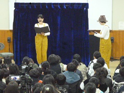 1月18日(木)に楠小学校で「よっかいち 小さな劇場」が行われました。上演作品は、別役 実(べつやく みのる)さんの「砂漠の町のXたんてい」の朗読劇でした。