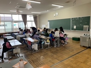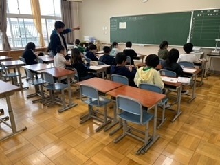算数では、少人数に分かれて、体積を求める問題に取り組みました。考え方を交流しながら解いていました。