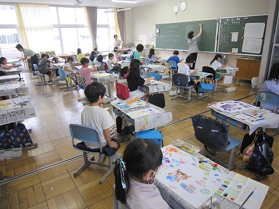 白のクレパスで絵を描いた後、水をたっぷり含ませた筆で色をのせていきます。