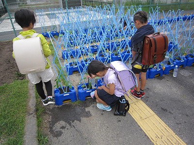 子どもたちは、ピーマンやナス、エダマメなど、自分で決めた野菜を一人一苗育てています。