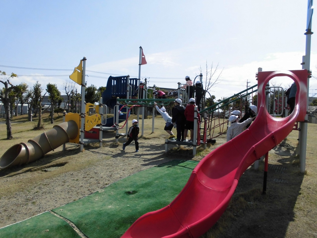 楠緑地公園や併設の楠交流会館などの施設やA-コープ、アオキなどのお店の様子を外から見学しました。楠緑地公園では、遊具のある芝生のところで休憩しました。