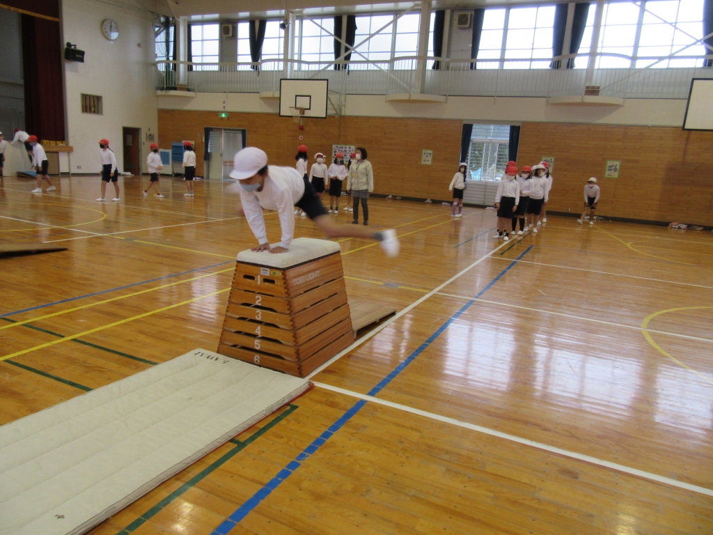 体育の時間に跳び箱に取り組んでいます。『ピタッと着地できるかな』を目標に、どこに気を付けて跳ぶとよいか、考えながらチャレンジしています。