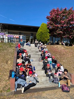 アスレチックを楽しんだあと、みんなでお弁当を食べています。