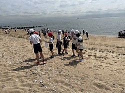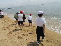 年生のきょうだい学年で一緒に吉崎海岸に歩いて行きました。吉崎海岸では波打ちぎわで遊んだり、貝がらを拾ったり、ビーチフラッグなどして楽しく過ごせました。