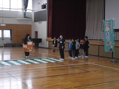 また、続けて行われたミニ交通安全教室で横断歩道の正しいわたり方などを教えていただきました。
