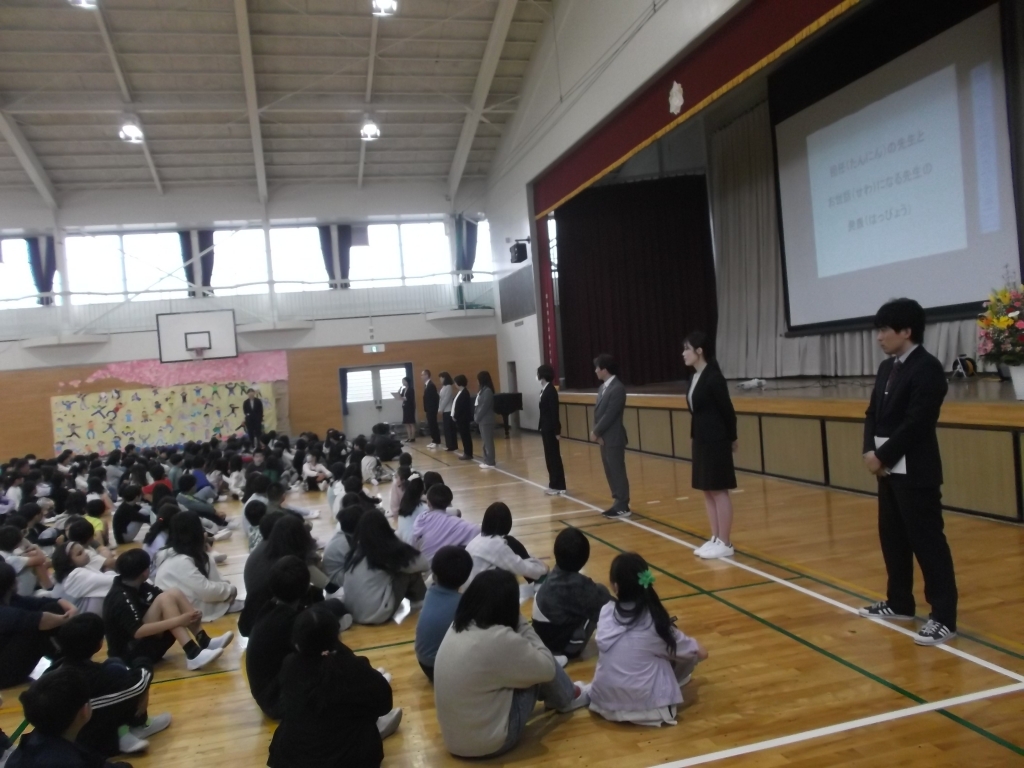 入学式では、新1年生が元気いっぱいに体育館に入場し、6年生からの歓迎のことばを受けました。