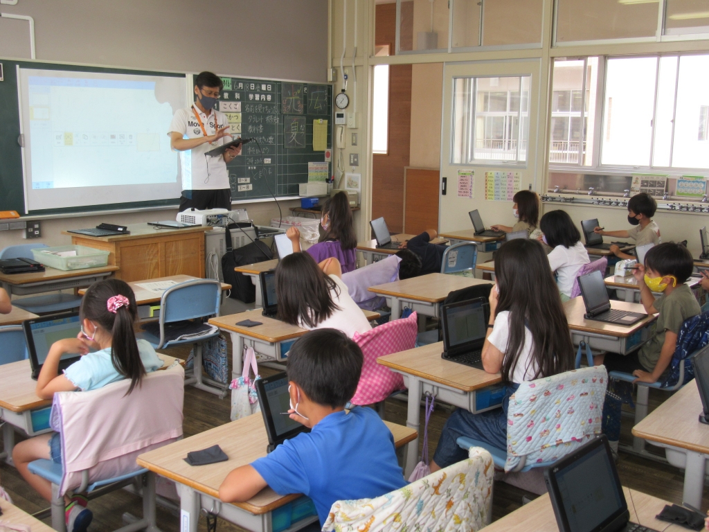 校長先生によるタブレットの授業です。準備や片付けも含め、使い方を少しずつ覚えています。