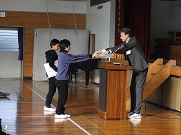 始業式に引き続き。大リーガーの大谷翔平選手から贈られたグローブの贈呈式を行いました。グローブの紹介をすると、子どもたちはとても興奮している様子がうかがえました。