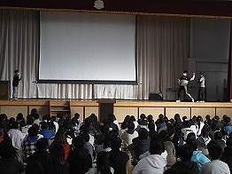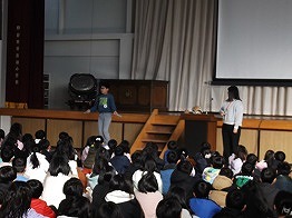 そのあと、体育館のステージでそのグローブを使って、代表の高学年の子どもがキャッチボールをしました。使い慣れていないグローブでしたが、上手にキャッチボールをしていました。全校の子どもたちはこの様子を見て、「早く使いたい!」という様子でした。
