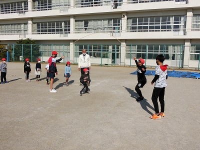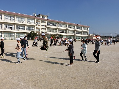 寒い時期の体力づくりの一環として、みんなでチャレンジが始まりました。クラスで協力しながら縄跳び運動に取り組みます。高学年の児童が低学年児童のために縄をまわす姿が見られたり、新記録が出るとみんなで拍手をして喜び合う姿が見られたりするなど、運動場のあちらこちらで笑顔の花が咲いていました。