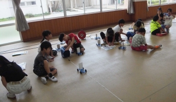 車に強い風や弱い風を当てて車が動いたきょりを調べました。