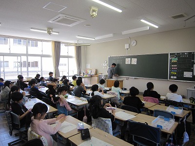 黒板に掲示した時計を使って確認しながら一問一問解いていきました。