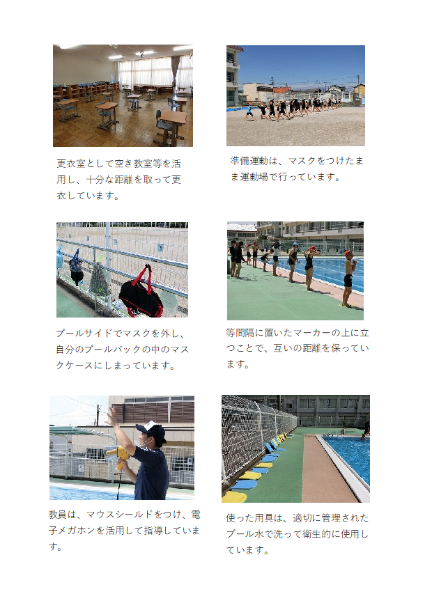14日(月)から水泳指導が始まりました。子どもたちにとっては、学校での水泳の授業は2年ぶりとなります。学校では、新型コロナウィルス感染症拡大防止のため、以下のような対策をとって水泳指導を行っていますので、ご理解のほどよろしくお願いいたします。