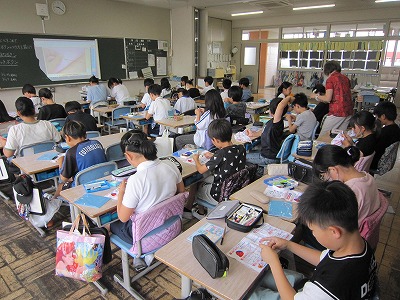 5年生では「いろいろなボタンの付け方を覚えよう」という課題で、ボタン付けをした後、小物づくりをしました。