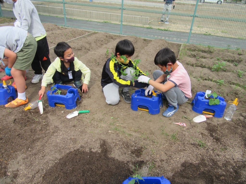 生活科「ぐんぐんそだて みんなの野菜」の単元で、野菜の苗を育てます。一人ひとり育てたい野菜の苗を選び、植木鉢に植えました。