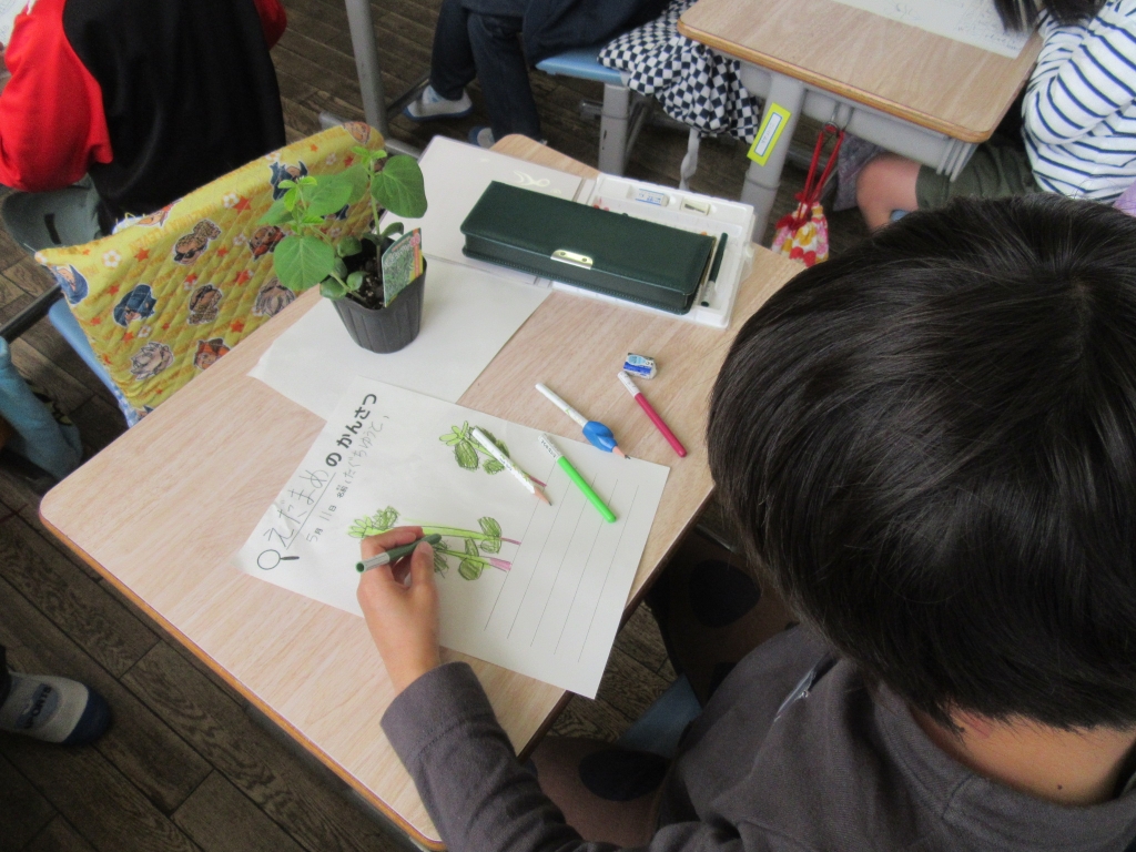 植える前に、葉っぱやくきの特徴をよく見て観察カードにかきました。「丸い葉っぱや。」「くきがちくちくしてるよ。」「よく見たら毛がいっぱいある!」と口々に言っていました。