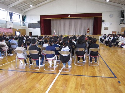 1年生が入学しました。6年生に手を引かれて会場に入りました。