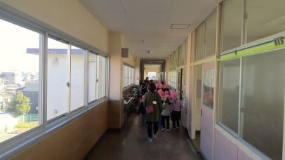 今楠こども園の年長さんたちは、学校長の案内で校内を探検しています。