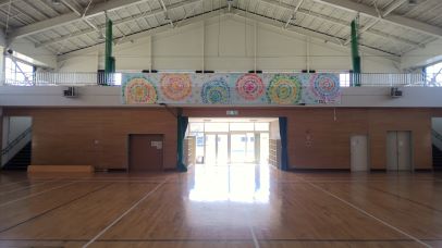 PTAの方々で主催していただいた「手形アート」の作品を、体育館に掲示していただきました。