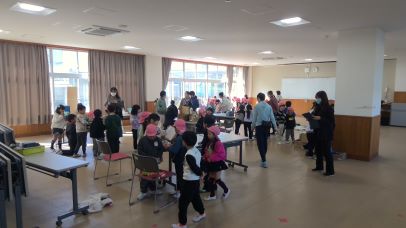 楠こども園の年長さんに来校いただき、1年生が作った遊び道具で交流会をしています。