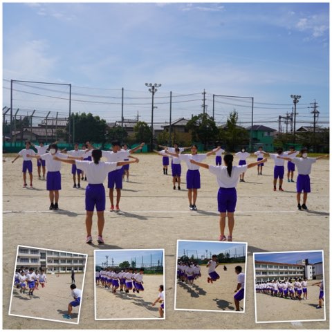 青空のもと、体育の授業で体育祭の大縄の練習がおこなわれています。暑さに負けず、並び方や回し方を工夫しながら、一生懸命に頑張っています。