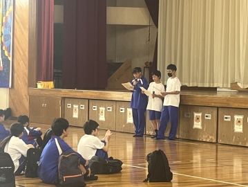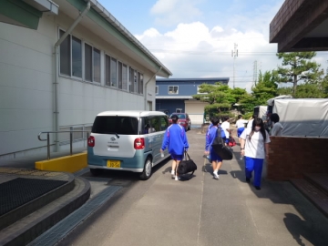 大きな荷物を配送トラックに積み込み、出発式をしています。