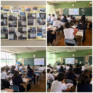 3年生の各教室では、修学旅行のふり返りをしていました。まずは各クラスごとのふり返りムービーを見て、とても盛り上がっていました。