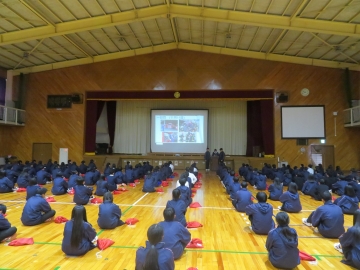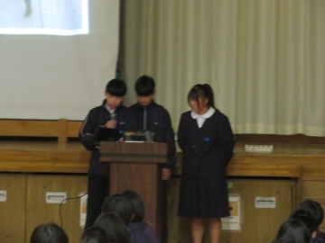 全校生徒が体育館に集まって、保健委員会が主催する保健集会を開きました。この日のために、委員さんたちはスライドや発表の準備を重ねてきました。この保健集会には、学校医・学校薬剤師の先生方も参観しました。
