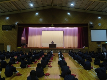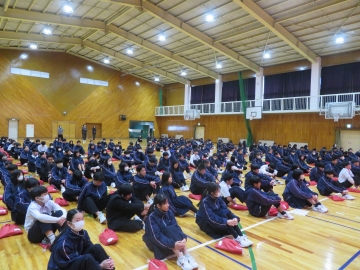 今日は2学期最後の日、終業式を行いました。式に先立ち、2年生は職場体験学習の発表をしました。代表の3グループは3日間体験した内容をわかりやすく発表していました。終業式では、校長先生から節目があるから成長する、新しい節目を大切にして新年を迎えましょうとお話をされました。新年度始業式に、みなさんの元気な姿で登校することを楽しみに待っています。