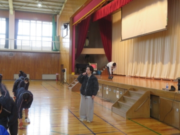はじめは恥ずかしさもあったようですが、ダンサーの方の明るい声かけや見本の動きに刺激され、次第に表情もほぐれ、全身を使ったのびのびとした表現が多く見られるようになりました。振り付けを確かめ合いながら、楽しそうにダンスをする姿が印象的でした。