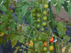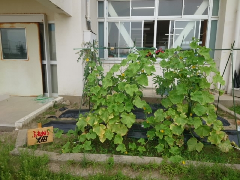 ふれあい畑には、夏野菜を育てています。とまと・ピーマン・きゅうりが収穫の時期となりました。とまとは鈴なりに実り、きゅうりはみずみずしく育ちました。収穫した野菜は生徒たちがおいしくいただいています。