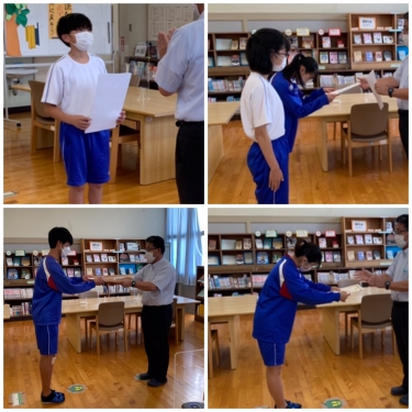 バドミントンの東條さんと山本さん、陸上の河原﨑さん、水泳の伊藤さん、新体操の佐川さんがそれぞれ代表で表彰されました。まだ途中経過ですので、全競技が終了した2学期にくわしくお知らせします。