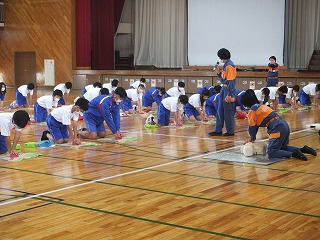 四日市市消防本部の消防士の方から,防災についての話を聴き,災害時や災害に備えて心掛けることを学びました。本校卒業生の方からのお話でより身近にお話を聞かせていただきました。その後,2つのグループに分かれて,起震車による地震体験と心肺蘇生法の流れについて実習をおこないました。