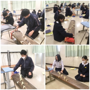 5限目、「♬さくら~さくら~♬」と琴の音色が ♪タンタタタン♪ と聞こえてきたので、中に入ってみると、1年生が音楽でお琴に挑戦していました。皆さん真剣な表情で、楽しそうに弾いていました。