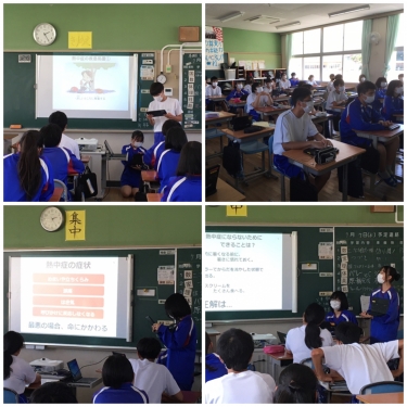 続いて、熱中症対策について、各教室で保健委員さんによるミニ健康教室が行われました。スライドショーを使い、熱中症にならないために、睡眠や朝食の大切さをわかりやすく解説してくれていました。皆さん、上手にプレゼンできていましたよ。すばらしい!