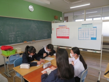 1年生の室長会では、3学期の抱負を掲示物にまとめ、室長たちは「どんな取り組みをしていこうか」「クラスをよりよくするために何ができるか」について、意見を出し合いながら話し合っています。学年のリーダーとしてクラス全体に前向きな雰囲気を広げていこうとしています。