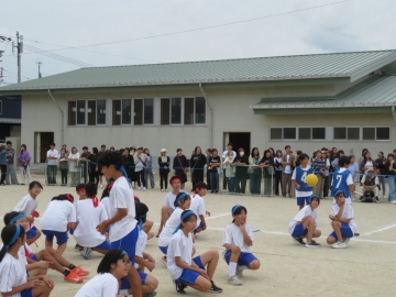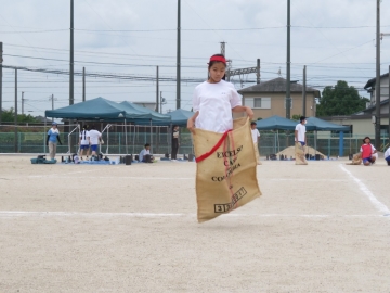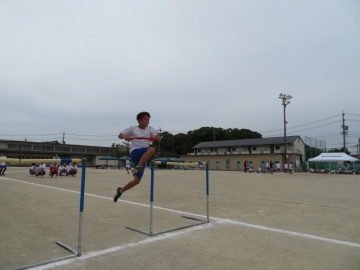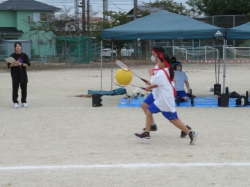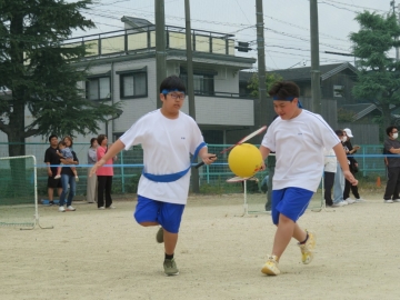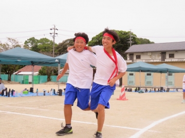 生徒たちは、それぞれハードル走→ラケットでボール運び→麻袋ジャンプ→二人三脚のエリアを担当し、全員でタスキをつなぎます。